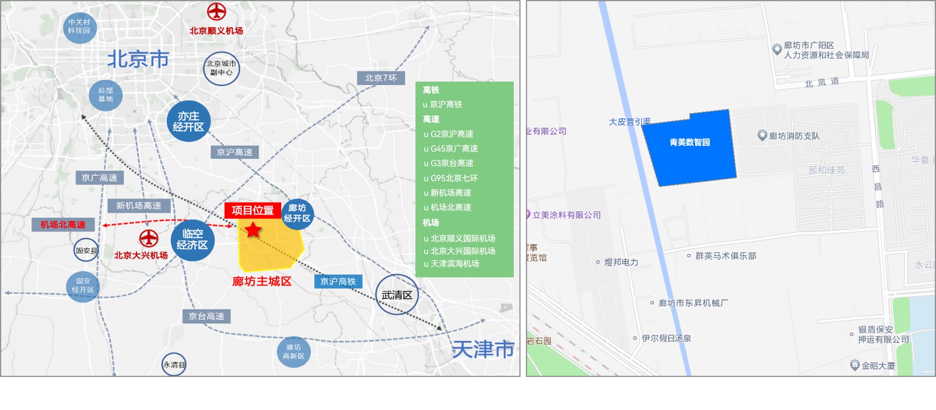 区位:园区位于京津冀一体化中心城市——廊坊市主城区西北部,北邻北京亦庄经济开发区,西接大兴机场临空经济区,东靠廊坊经济开发区,科技研发与新兴产业孵化产业基础雄厚,未来发展潜力巨大。具体位于廊坊市广阳区北凤道619号,西侧为大皮营引渠,北侧为北凤道西延线,南侧为韵达物流,东侧为廊坊市消防支队。