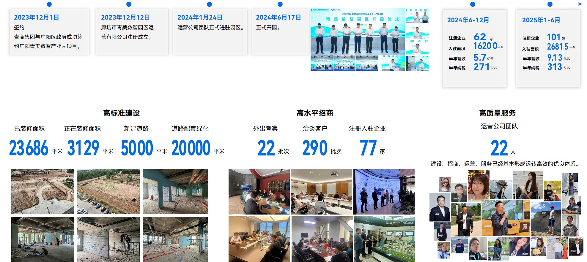 高起点谋划、高标准建设、高水平招商、高质量服务。快速的装修、快速的招商、快速的建立完善运营体系。